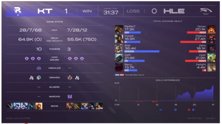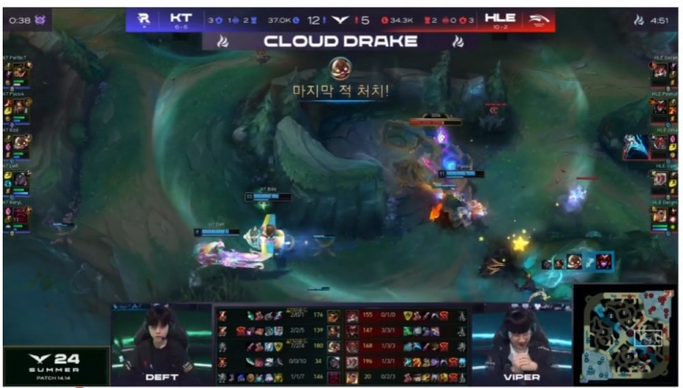 中期KT围绕大龙做文章,连续两次击杀掉了Doran纳尔+Zeka卢锡安,但是他们打大龙实在太慢,反而是没闪的Bdd库奇龙坑上挡人被开,让HLE打出0换2之后大劣势收下大龙!不过随后的小龙团战Viper泽丽爆闪越墙想收残血,落地吃了Bdd库奇一发导弹人没了!KT第二次团灭HLE推掉下路奠定胜局!最终KT在上路+野区同步开打一波0换4,成功赢下首局!