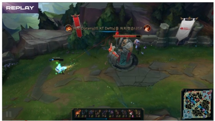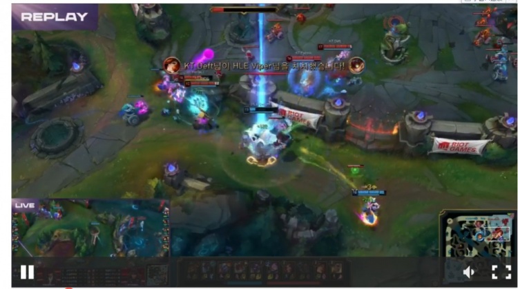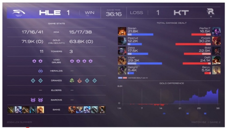 第二局比赛双方前期平稳发育,11分钟才爆发一血,Viper炸弹人拿下一血但是团战被KT打了个3换4!不过HLE因为有小炮还是在边带+推塔上有优势!19分钟Doran纳尔+Delight牛头帮助HLE打出2换3收下关键的第三条小龙!随后第四条小龙HLE果断放掉转头拿到大龙!不过团战端有队友保护的Deft女枪哈哈哈AOE伤害爆炸连续两次击杀Viper炸弹人!HLE又依靠Delight牛头粘人逮捕了KT野辅收下二大龙!最终的龙魂团Deft女枪哈哈哈抢下龙魂,代价就是站在一起被Doran纳尔拍了个爽!HLE击杀KT双C,打出0换4扳平了比分!