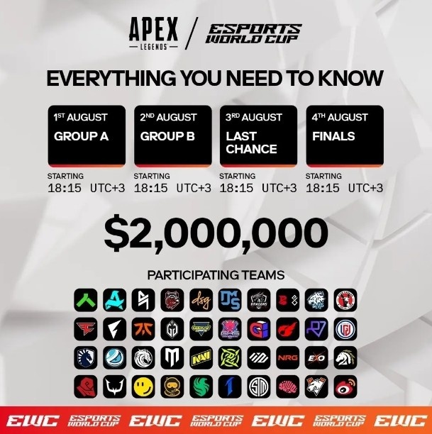 直播吧7月31日讯 EWC电子竞技世界杯Apex项目将在8.1至8.4举行。石油佬终于官宣了详细的比赛时间和赛制,本文为大家详细介绍!