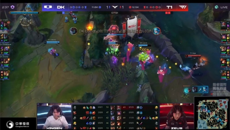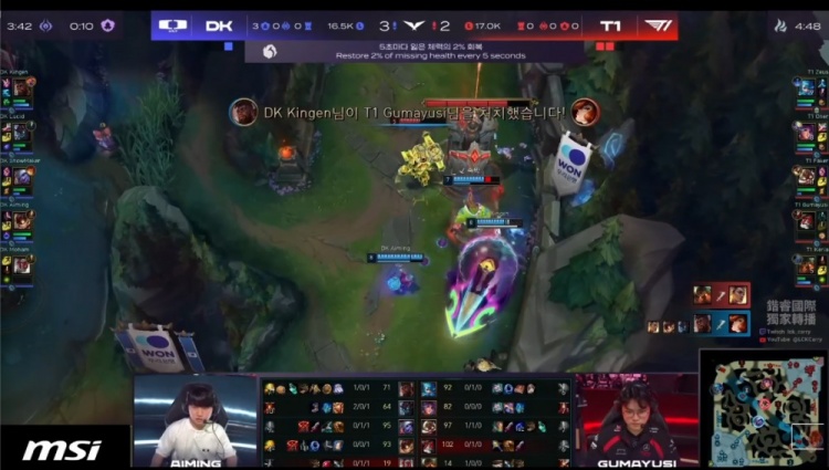 【10:20】kingen下路直接赶来配合自家打野和下路双人组对T1动手,女枪被DK收下,泰坦塔下换掉芮尔!