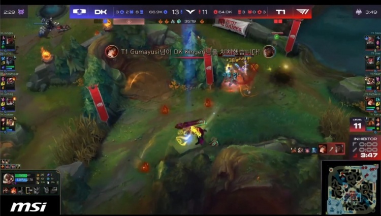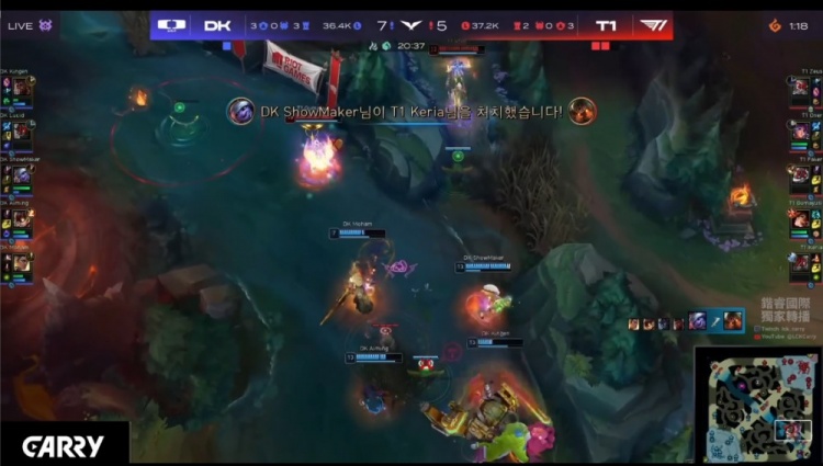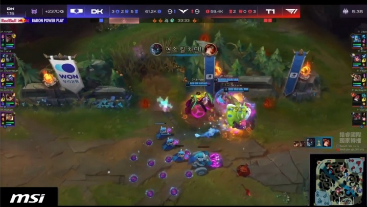【38:20】DK等到大龙复活直接动龙,T1想要赶来看,格温绕后TP直接被DK秒掉,随后T1四人正面溃不成军,DK团灭T1后成功拿下比赛胜利!