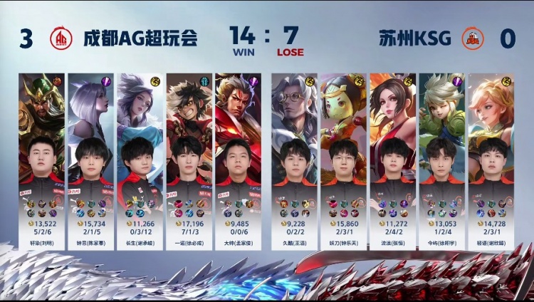 【20:10】双方围绕风暴龙王爆发团战,AG拿下龙王后直接对KSG强开,KSG被击杀四人,随后鲁班和鲁班七号想要守塔但是还是被AG拿下,AG拿下胜利!