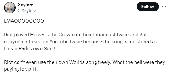 网友爆料称直播间被封禁是因为林肯公园连发两条版权警告才导致直播中断,并且该歌曲被已经林肯公园注册为他们自己的原创歌曲,在没有取得允许的情况下拳头不得进行播放;并且猜测出现这样的原因是因为由于拳头对林肯乐队的“重视”和讨好,让林肯公园有恃无恐,并将本次S14主题曲注册为自己的歌曲!