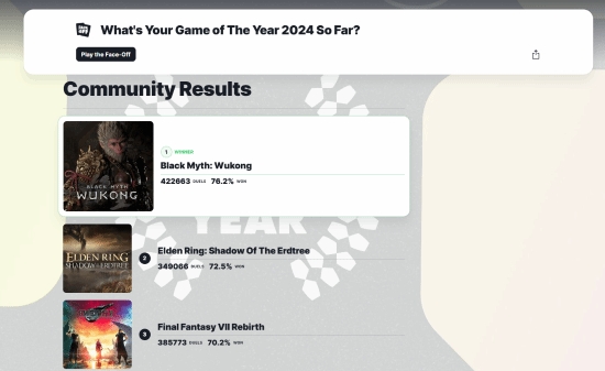 不过仅仅过了两天,《黑神话:悟空》再次凭借76.2%的支持率再次登顶该榜单,目前排在榜单前五名的分别是: