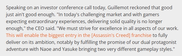 其在最近的电话会议中表示:“在当今充满挑战的市场中,玩家期待非凡的体验,提供可靠的质量已不再足够,我们必须在工作的各个方面追求卓越。这将使《刺客信条》系列中最大的作品能够完全实现其雄心壮志,特别是通过履行我们双主角冒险的承诺,奈绪江和弥助带来了两种截然不同的游戏风格。”