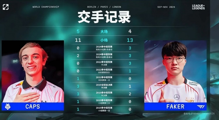 直播吧10月11日讯 2024全球总决赛瑞士轮T1对阵G2正在进行,中文流直播放出了Caps和Faker历史交手记录: