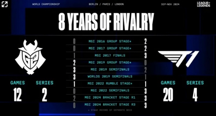 同时英文流放出了G2和T1历史交手记录: