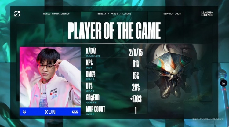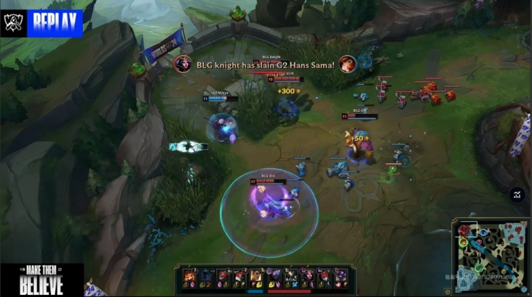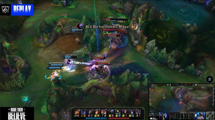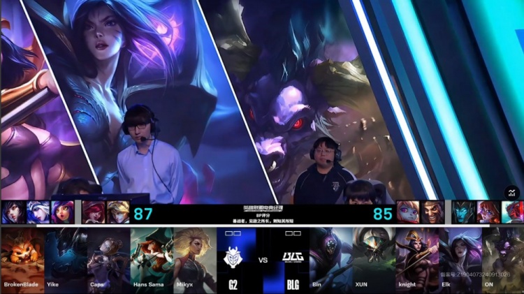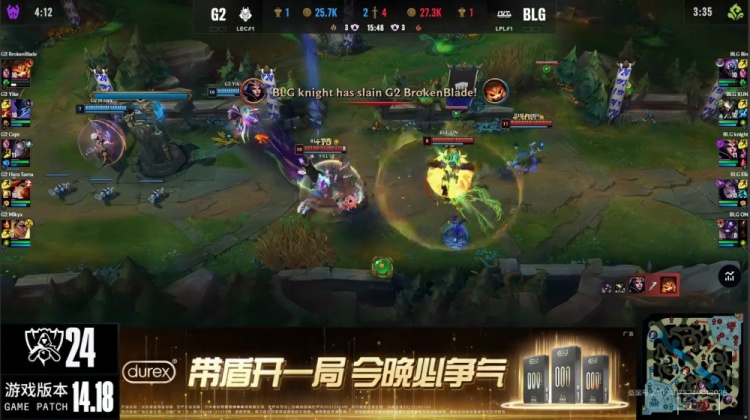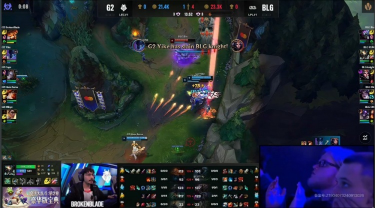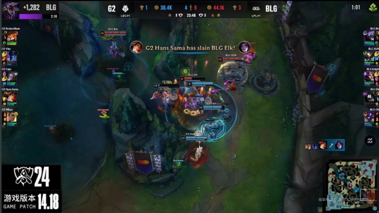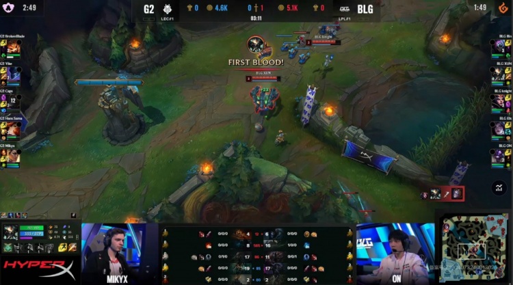 第一局前期BLG选择换线,但G2四人来下越塔失手,后续ON线上帮助Elk带走Mikyx,BLG全线优势。中期Mikyx芮尔连续阵亡,BLG打出1换2轻松收掉大龙,经济领先6k。