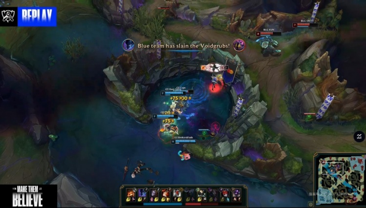 【22:17】大龙团,芮尔迷路先被妖姬带走,牛头补掉MF,卡莎被伤害灌死,BLG打出1换2吃掉大龙,经济领先6k。