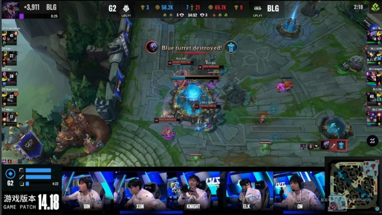 【16:50】BLG中路放出先锋撞掉G2一塔,经济领先3k。