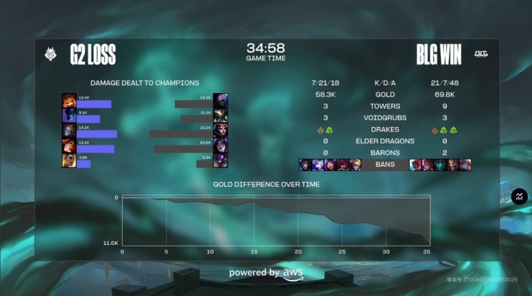 后期HansSama女枪开大扫掉BLG双人组,但阿Bin贾克斯进场收割,双方打出2换2,BLG经济优势来到6k。最终BLG吃掉大龙团灭G2,轻松推平G2基地先下一城。