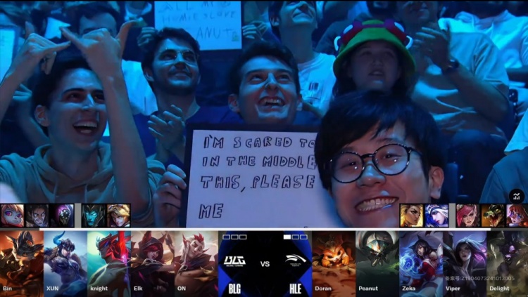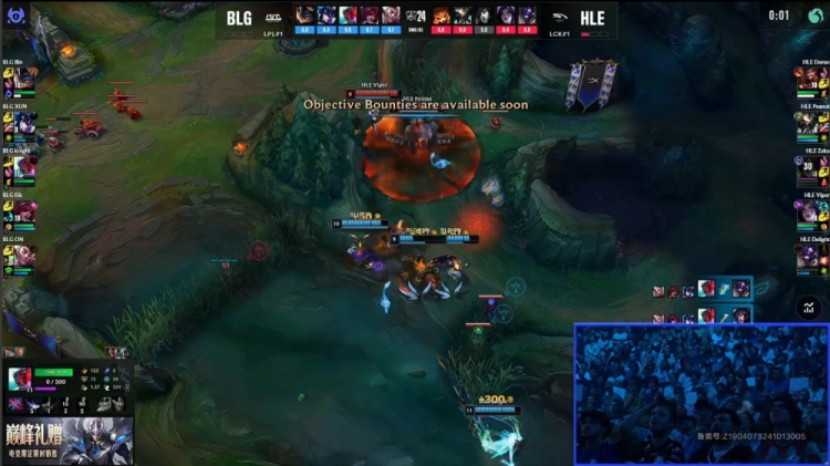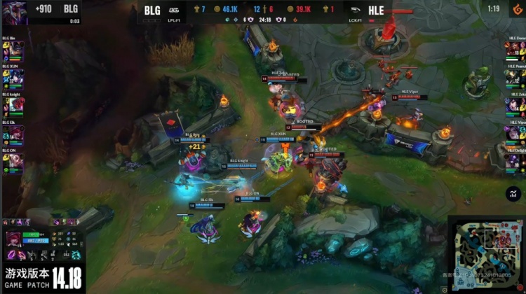 中期Delight牛头河道开团与Zeka送knight永恩双杀,Zeka后续去上与Doran想抓阿bin,Doran却被阿Bin反杀。小龙团前BLG打出0换2推掉HLE下路二塔,Zeka河道一套打残Elk让Viper拿到终结,HLE打出1换3但经济落后6k。BLG全员复活后迅速掏掉大龙,让经济优势回到8k。