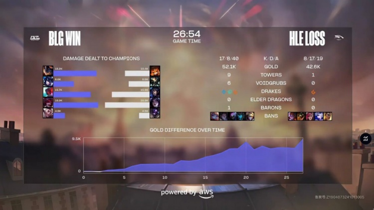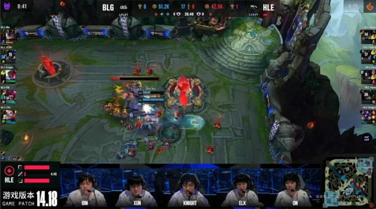 后期BLG中路推进,ELK霞倒钩拉三人,HLE再无一战之力在小龙团被BLG打出1换4,BLG一波推平HLE基地扳回一城。