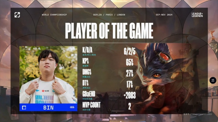 第二局前期Bin兰博上路抗压,Xun一次来上与阿Bin联手两分钟内连杀Doran两次。ON洛抬起Viper让BLG打出0换2吃掉六条巢虫,经济领先3k。