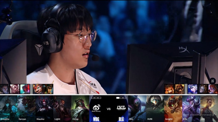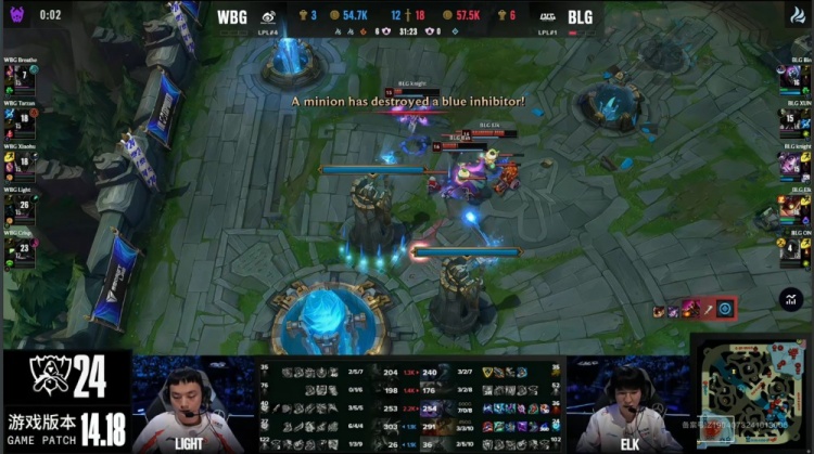 第二局开场Light河道脸探草丛被BLG众人集火送knight一血,随后WBG四人越下被打出1换1。Xun蝎子来中抓掉Xiaohu后,先后又在中路与上路三角草抓掉Xiaohu。WBG连吃两条小龙止损,双方经济差距不大。