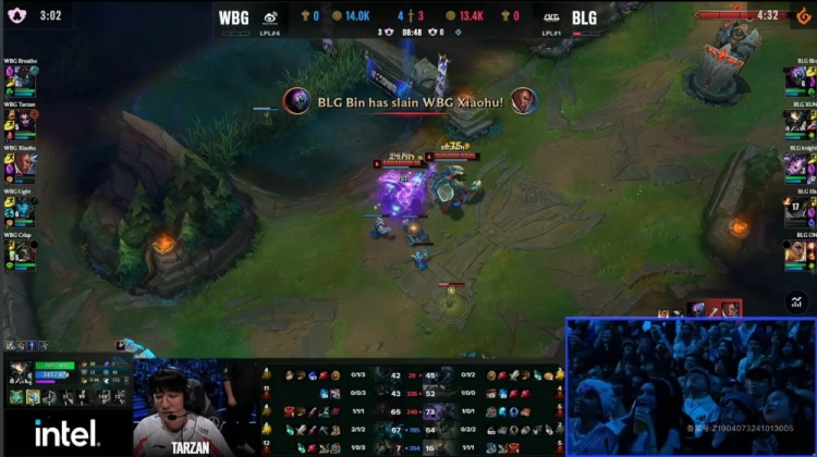 【22:04】卢锡安在自家上路三角草被蝎子逮捕,蝎子人头心之钢全吃,BLG推掉WBG上路二塔,双方经济持平。