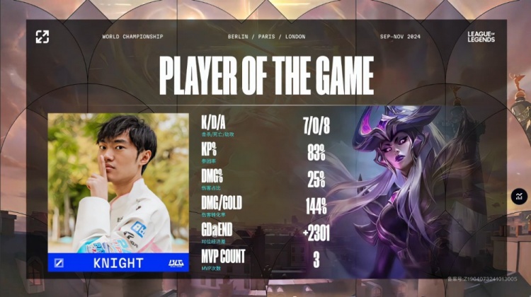 【1:45】河道一级团,卡莉丝塔脸探草丛被芮尔开到,BLG集火带走Light一血,knight辛德拉拿到人头。