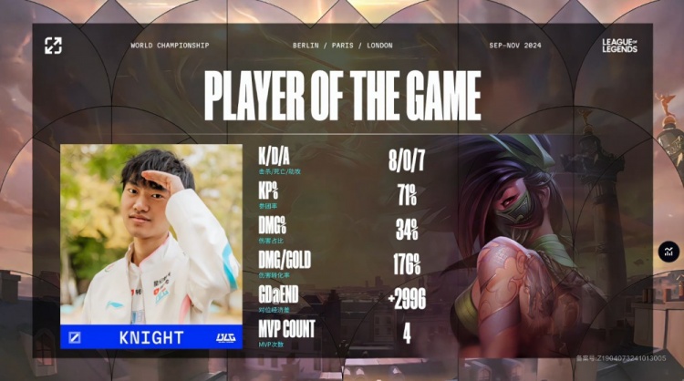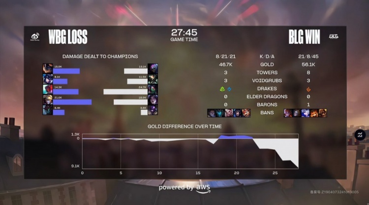 后期野区knight阿卡丽无人能挡团战乱杀,BLG再次团灭WBG推掉中路水晶。最终WBG正面再无一战之力,BLG摧枯拉朽叒将其团灭,一波推平WBG基地拿到比赛胜利晋级决赛。