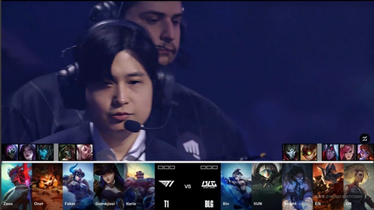 第一局开场Gumayusi脸探草丛,被knight与ON控住送Elk艾希一血,前期Xun蝎子去上与阿Bin强杀Zeus得手,但Zeus纳尔随后上路变大拍BLG双人组上墙,与Faker各拿到一个击杀,双方经济持平。