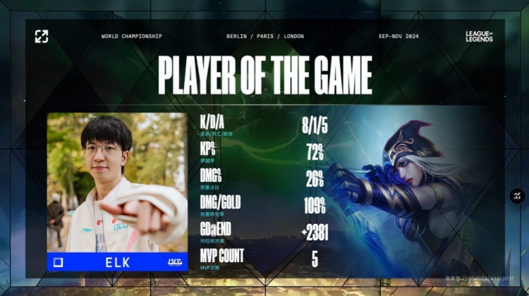 中期中路团战,ON芮尔开大吸三人,Elk艾希狂射拿到三杀,BLG打出0换3,放出先锋连续推掉T1中路两座外塔,经济瞬间领先4k。紧接着阿Bin下路将Faker打至残血,Elk艾希千里神箭去下击杀Faker。