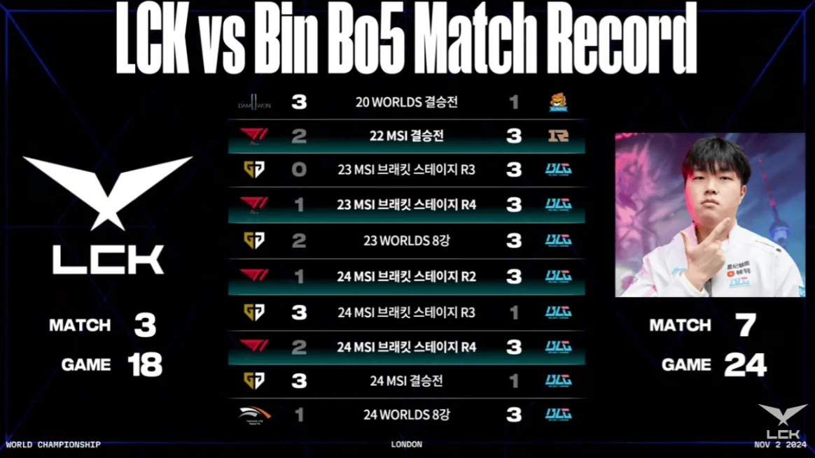 直播吧11月2日讯 2024英雄联盟全球总决赛BLG vs T1赛前,韩文流放出LCK vs Bin的BO5战绩。