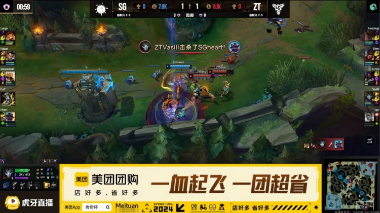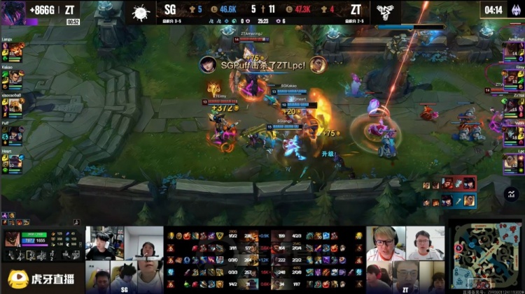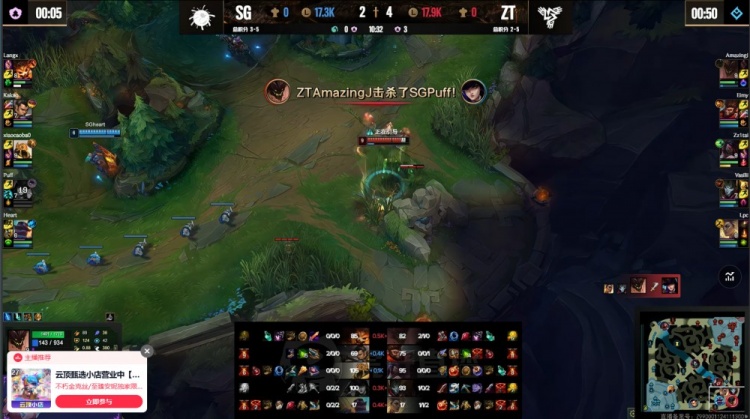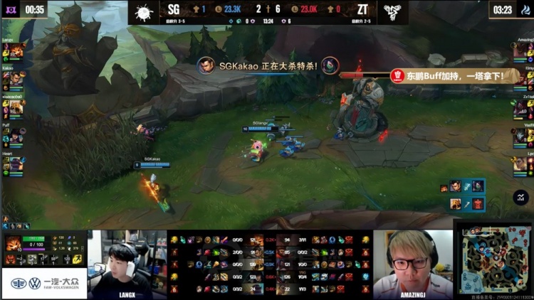 【6:54】上路小草包吃蛤蟆被抓,宣告三角草架狙,下路泡芙队三人越塔击杀AJ,Heart布隆扛塔被换。