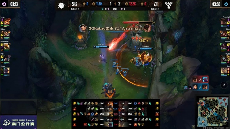 前期AJ石头人与姿态阿卡丽先后TP绕后冲掉泡芙女警,小草包上路幽默送头,Kakao河道也被逮捕,姿态队轻松打出0换2吃掉大龙。中期姿态队下路强冲二塔反被泡芙队打出1换2,双方经济拉平,泡芙队吃掉风龙魂。