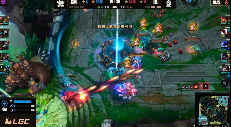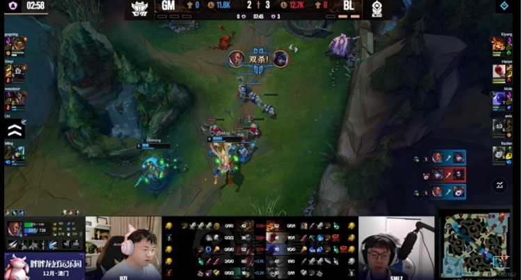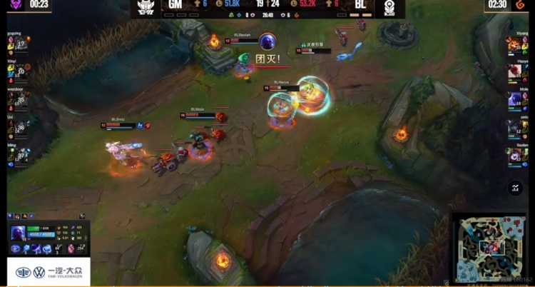 【12:00】野区交战Gogoing鳄鱼击杀掉了Xiyang纳尔,但是haoye盲僧强势战力,配合队友不断追击打了个1换3!下路Uzi卢锡安和Smlz厄斐琉斯火拼互换,复活的GM众人依靠西门卡牌大招再次抓死Mole瑞兹!双方这波乱战打完,但是BL拿下6虫!