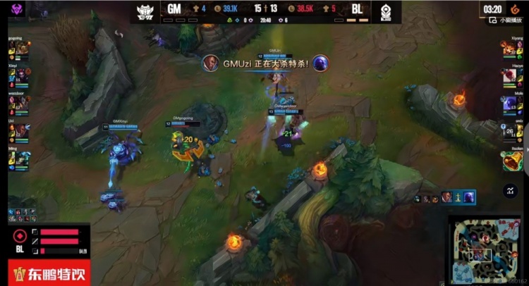 【22:45】野区遭遇,Xiyang纳尔完美怒气进场留人,Uzi卢锡安和Smlz厄斐琉斯各自双杀!Mole瑞兹金身开秀击杀Uzi卢锡安之后配合Baolan璐璐追死了Ming娜美,这波BL团灭GM!随后拿下第三条小龙!