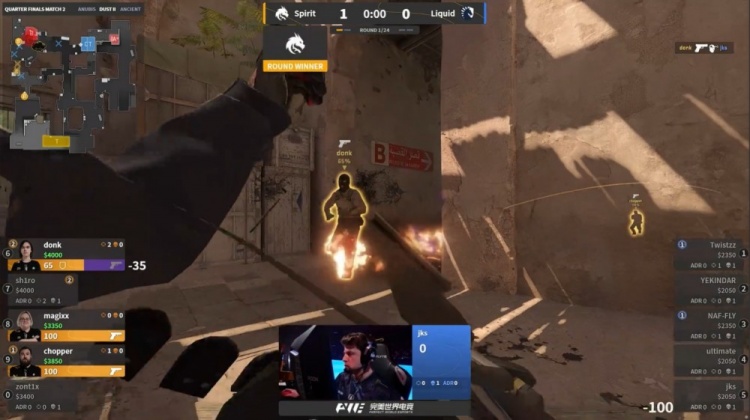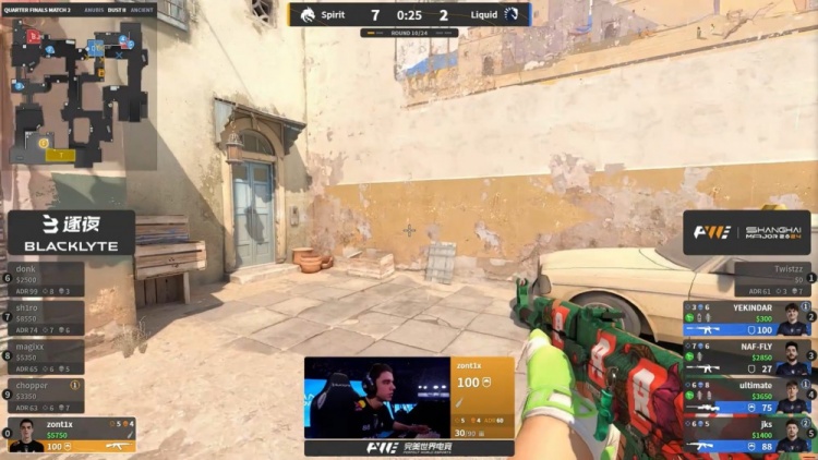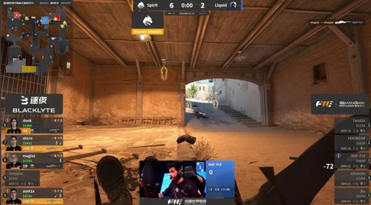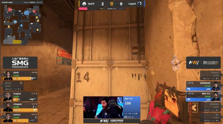 上半场Spirit先攻,手枪局Spirit三人去B,TL两人看B前点,donk从B下地道去中,ultimate在中门先被带走,NAF在包点也被缴掉,jks在B洞被前后包夹带走,Spirit1-0TL。
