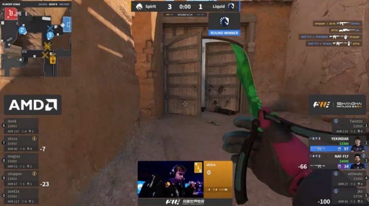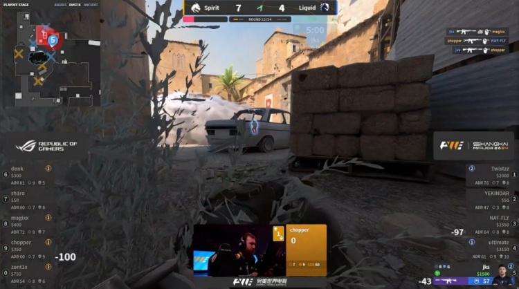 第十二局sh1ro中路对狙被杀,NAF与ultimate继续双狙防守,Spirit四人rushB击杀YEKINDAR,残局3V3,Spirit在B下包,总监狗洞带走zont1x,残局2V2,chopper在死点看B门,magixx先被击杀,chopper马枪也被带走,jks拆掉C4,Spirit7-5TL。