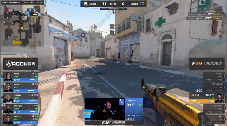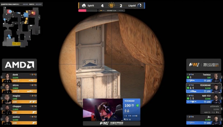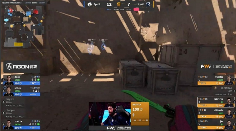第十一局双方长枪局,Spirit两人中路前压后跳上A小,ultimate依旧A大架狙看A小,Spirit四人集结来A小冲点,ultimate大狙双杀,donk瞬间被秒,magixx退出A小偷掉YEKINDAR后捡到雷包,但屁股后面的NAF到位将其击杀,Spirit7-4TL。