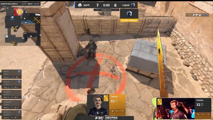 第十九局TL四人走中转A小,Spirit放掉A点,sh1ro在A大反看A包点,TL四人A小空降带走sh1ro,chopper也被击杀,donk中路开杀拿到四杀,C4爆炸,Spirit12-7TL。