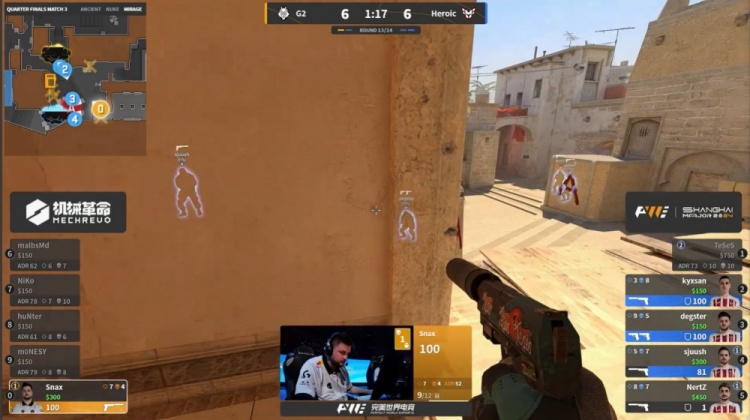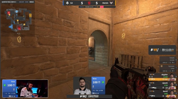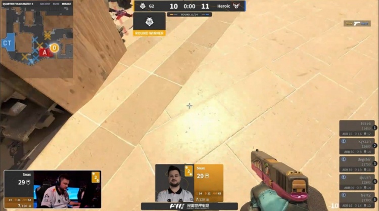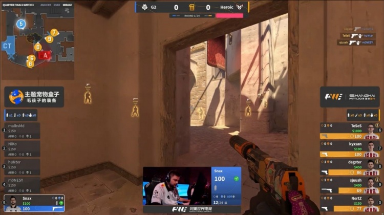上半场Heroic先攻,手枪局Heroic五人冲A下包,G2四人正面被带走,snax在vip瑟瑟发抖,Heroic1-0G2。