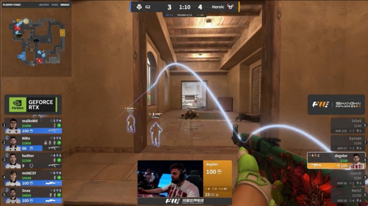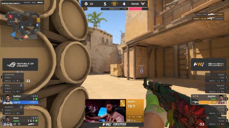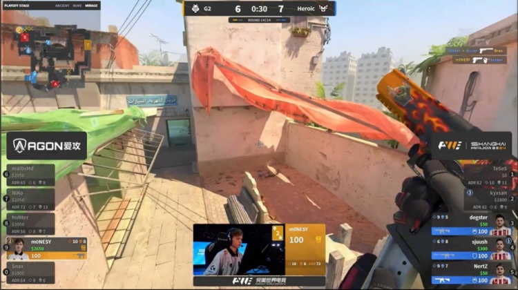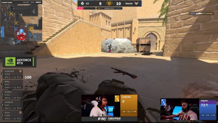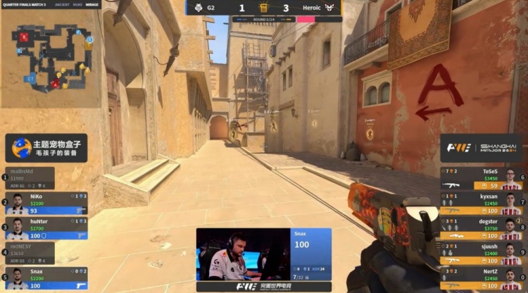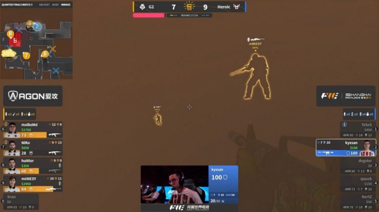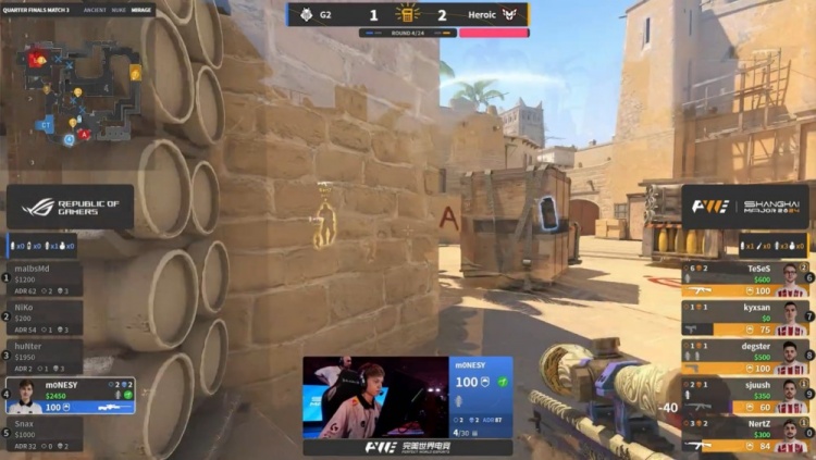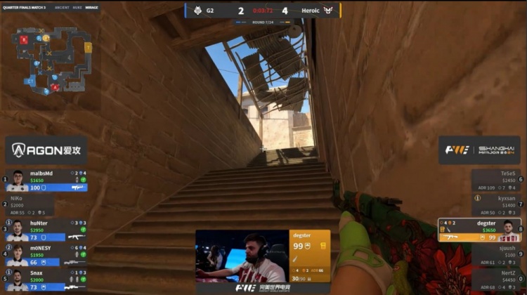 图三荒漠迷城上半场Heroic先攻连续打A得手拿分,G2暂停回来打炸Heroic经济反超比分,degster残局三杀将比分扳平,m0NESY在B精准架狙让双方上半时战平 。