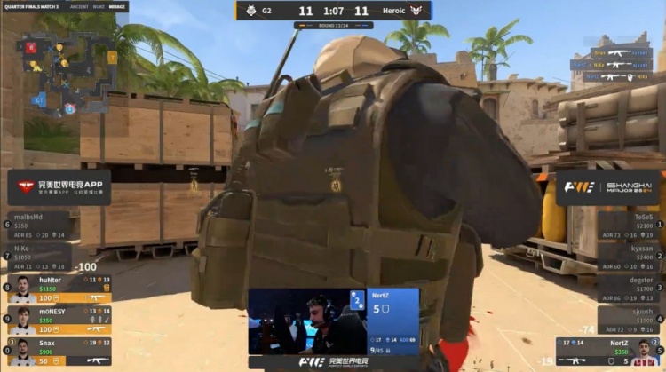 第二十三局NertZ拿出英雄M4,G2四人来中提速去B,B小snax带走拍拍熊,Heroic枪械劣势光速被团灭,Heroic11-12G2。