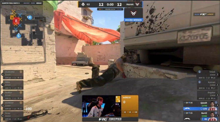 第二十四局Snax中路见面被杀,G2四人冲B,包点2换2,NertZ拉出超市击杀hunter再杀白车niko,monesy在白车1v2,sjuush二楼下击杀太子,Heroic12-12G2,双方进加时赛。