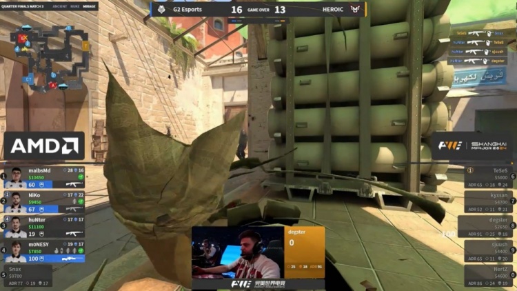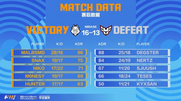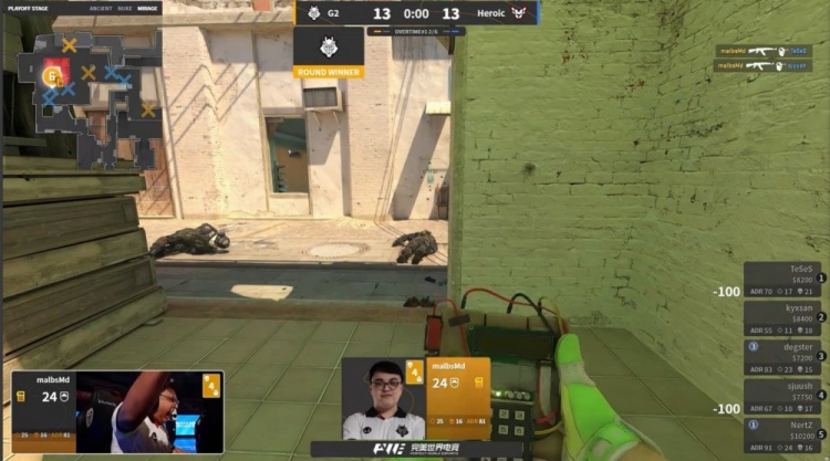 加时赛中malbsmd拿下1v2残局帮助G2咬住比分,hunter与niko发力让G2连拿3分,最终以16-13的比分淘汰Heroic晋级四强。
