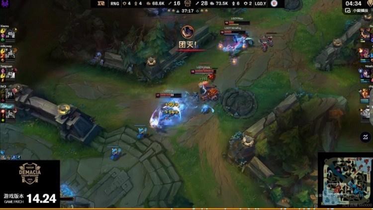 【25:44】LGD.Y下路强拆二塔击杀Lele牛头,RNG抱团反打一路追击强杀掉了Nuo兰博,还拿下了战略点小龙!经济差还有6K!