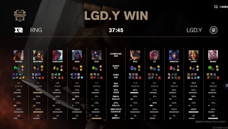 本局比赛前期双方平稳运营,中期LGD.Y几波团战轮流发力一度拿下6K的经济优势,RNG依靠Lele牛头几波好开打出反扑,一度强行将经济差拉回到2K,还拿下大龙有翻盘的希望!但是关键龙魂团Tangyuan永恩直接吃控白给,RNG没有最大输出点了!milkyway豹女也没活下来!LGD.Y团灭RNG,送给对手两连败!