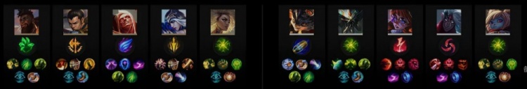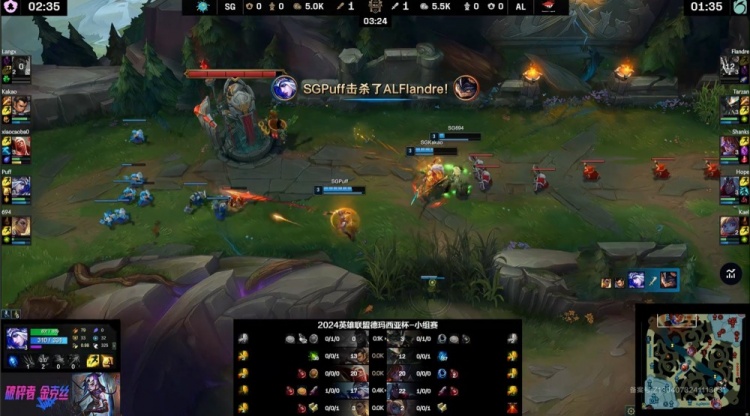 蓝色方SG:LANGX奎桑提、KaKAO赵信、Xiaocaobao吸血鬼、Puff艾希、694芮尔