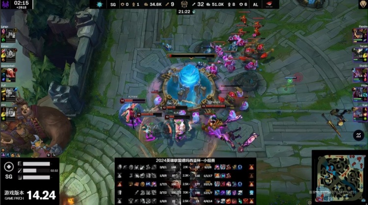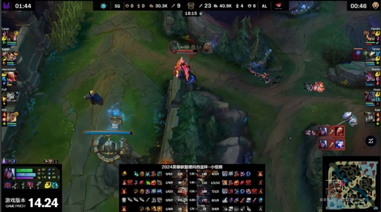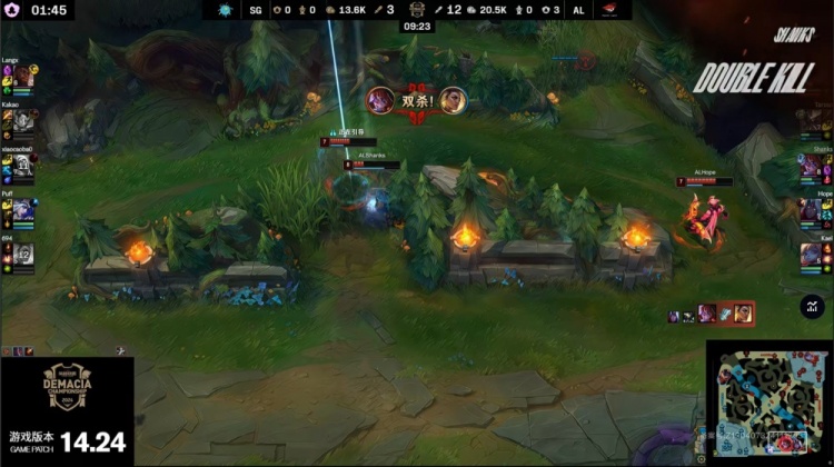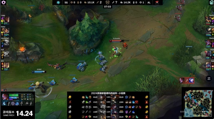 前期泡芙队双人组换线越塔成功带走圣枪哥,下路混战小草包5级吸血鬼支援送头,王杰一箭射穿泡芙艾希,AL打出1换4。王杰线上抓到机会再杀泡芙不断收头,狼X奎桑提被越后河道三杀但无济于事,10分钟AL经济领先6k。