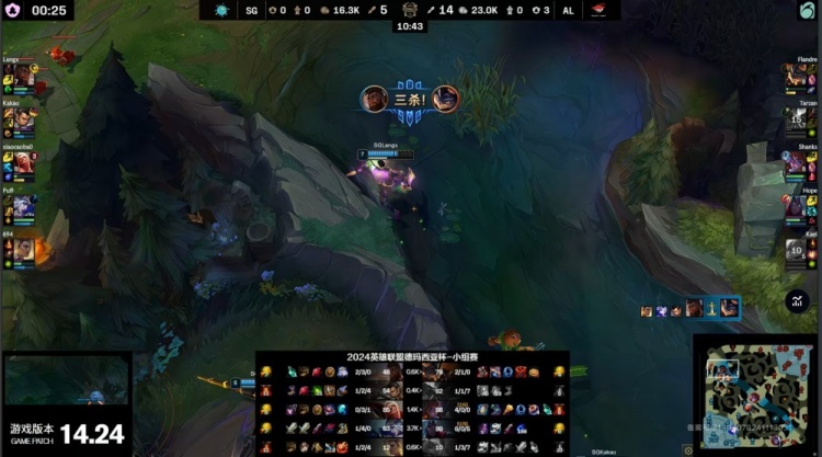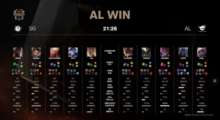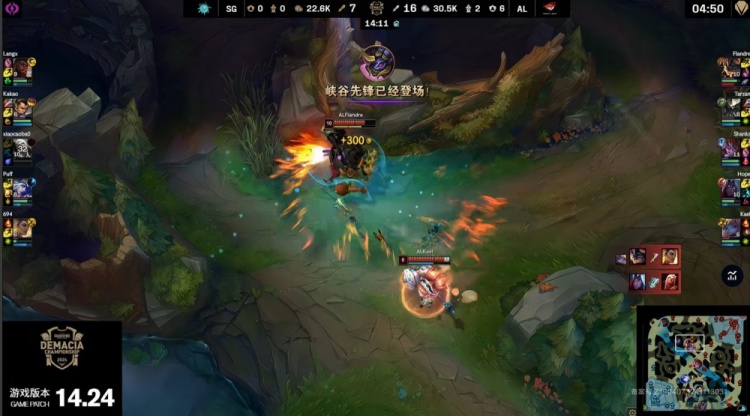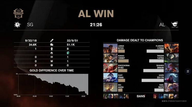 【10:01】Kael波比来上配合flandre兰博带走狼X,随后上路河道狼X奎桑提穿梭闪拿到三杀,同时中路shanks单杀小草包后被泡芙来中换掉,AL领先6k。