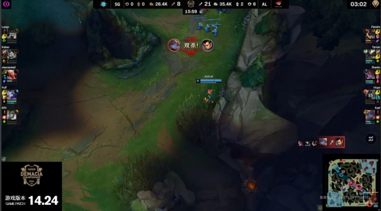 【3:14】泡芙队双人组换线去上,kakao赵信去上gank与双人组越塔带走Flandre兰博,同时下路狼X奎桑提TP回线被AL三人越掉。