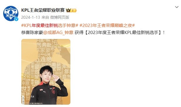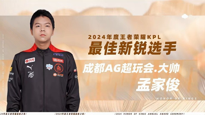 直播吧1月12日讯 今日2024王者荣耀巅峰之夜颁奖典礼,成都AG超玩会选手大帅获得2024年度KPL最佳新锐选手。