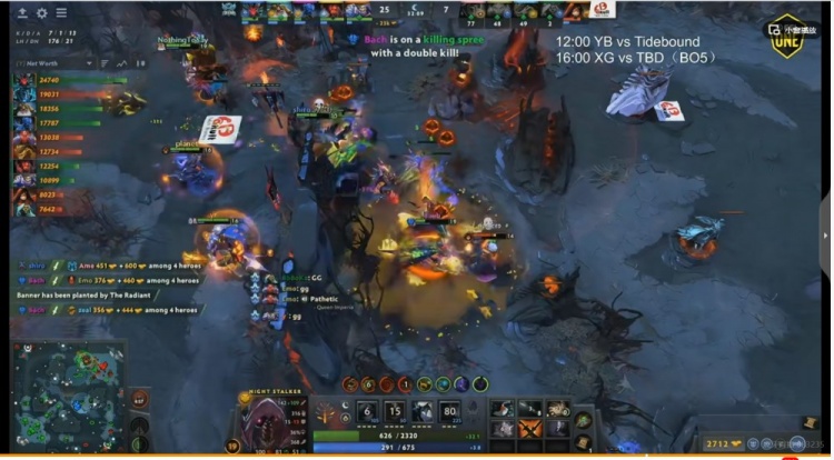 【24分钟】野区团战,YB面对这次有大招的Bach夜魔和A杖在手的planet毒狗毫无办法!只有双大哥可以撤退!Tidebound一波0换3,重新把经济差拉回到接近一万!