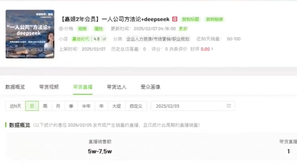 网友发现,带有DeepSeek相关的线上课程已经在不少平台热卖,以《一人公司方法论+deepseek》为例,在2月5日当天3小时直播中就卖出了超过5万元的销售额!