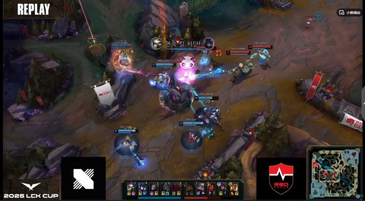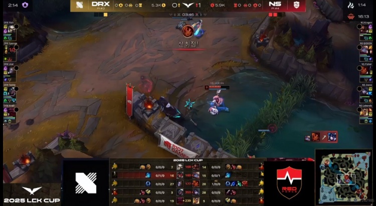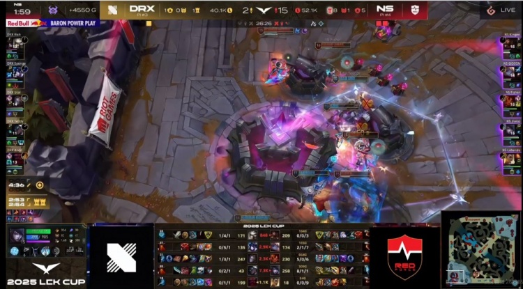 【25:25】Jiwoo厄斐琉斯连续白刀,NS两人就打掉了大龙!Rich青钢影被GIDEON波比锤飞!正面Jiwoo交闪向前,红白刀飞轮海开肿收割战场!NS打出0换3!一波结束比赛!将DRX淘汰出局送去放假!