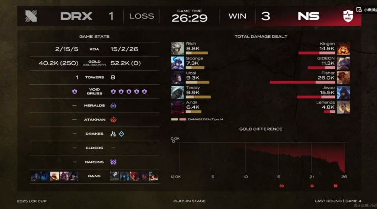 第四局比赛GIDEON波比前期节奏不断完爆Sponge猪妹,Fisher岩雀还抓住UCAL发条失误的机会完成对位单杀!NS一路优势稳扎稳打,拿下厄塔汗之后被Andil辅助奥恩绕后埋伏一波掉俩复活甲无碍大局!Jiwoo厄斐琉斯白刀助力rush大龙之后果断向前闪现!满速飞轮海完成战局收割,NS淘汰DRX晋级季后赛,第一轮单败将战KT!