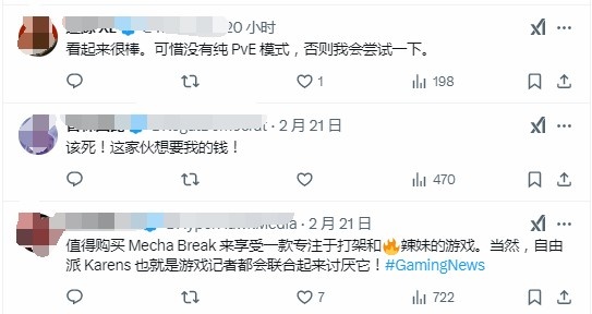 评论区不少网友都给出了相当高的评价,称赞该作不仅角色美丽动人,机甲战斗也是相当流畅精彩。除此之外,还有玩家期待能在PS5上玩到这款游戏,同时希望官方能推出更受欢迎的PVE模式。